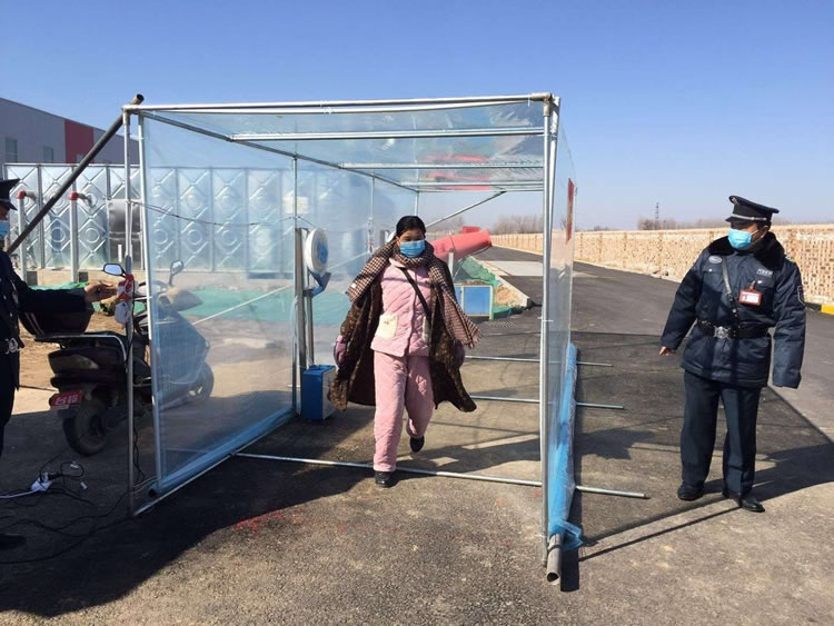 2、翱翔科技有限公司防疫嚴密,利用公司產(chǎn)品設(shè)立防疫消毒通道,保安員負責測量人員體溫、登記,監(jiān)督人員在防疫通道消毒后進入廠區(qū)。