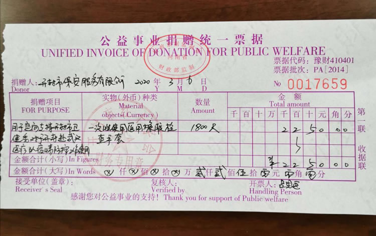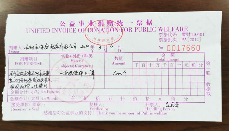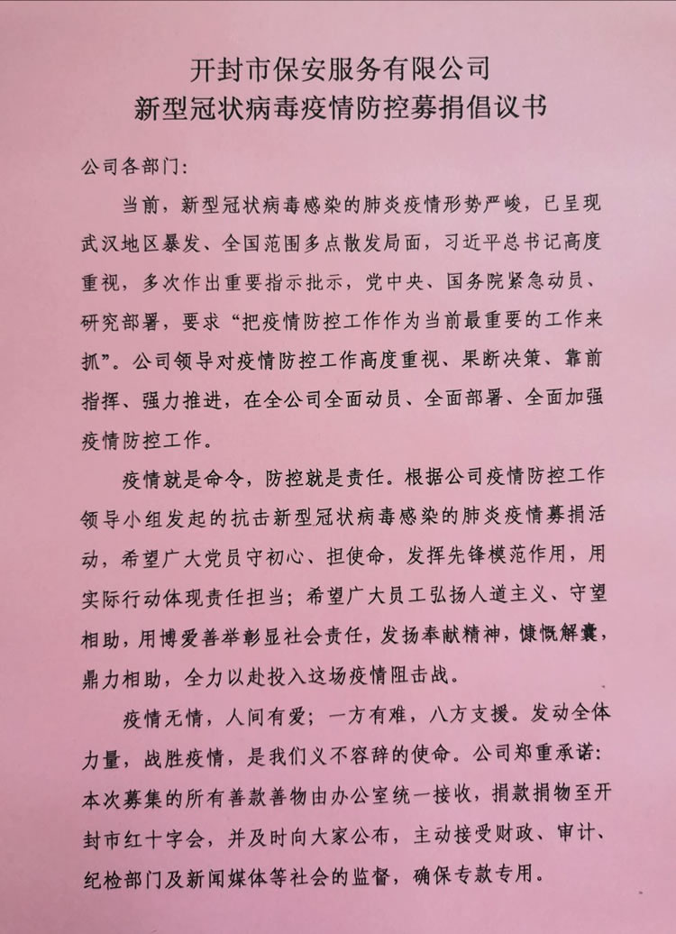 2020年3月2日,公司發(fā)起了新型冠狀病毒疫情防控募捐倡議書,倡議全體人員捐款、捐物支援疫情嚴(yán)重地區(qū),助力武漢抗擊疫情。全體員工積極響應(yīng),紛紛捐款,僅一天時間就籌集善款32737元。公司孫國杰總經(jīng)理在抗疫物資緊缺的情況下,多方聯(lián)系外地的廠家,購買防疫物資,此次公司向開封市紅十字會捐贈抗疫物品一批,價值18033元:醫(yī)用一次性口罩1000個、護(hù)目鏡190個、防護(hù)服20套、醫(yī)用一次性手套1800只、電子體溫計1個。并及時通過河南省保安協(xié)會聯(lián)系疫情嚴(yán)重地區(qū)(湖北省保安協(xié)會),向災(zāi)區(qū)保安員表示慰問。