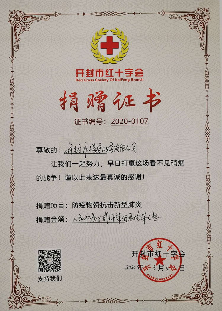 2020年3月4日,公司由副總經(jīng)理李梅帶領(lǐng)辦公室人員把所捐款項和物資交到了開封市紅十字會,用于定向支持開封市衛(wèi)生健康委員會對于開封赴武漢醫(yī)療隊疫情防控工作使用。